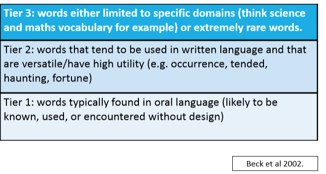 Teachers carefully select vocabulary they want to directly teach. Teachers plan direct instruction for tier two words, as they can have a powerful impact on verbal functioning and be applied to a range of different situations (Beck et al, 2013).